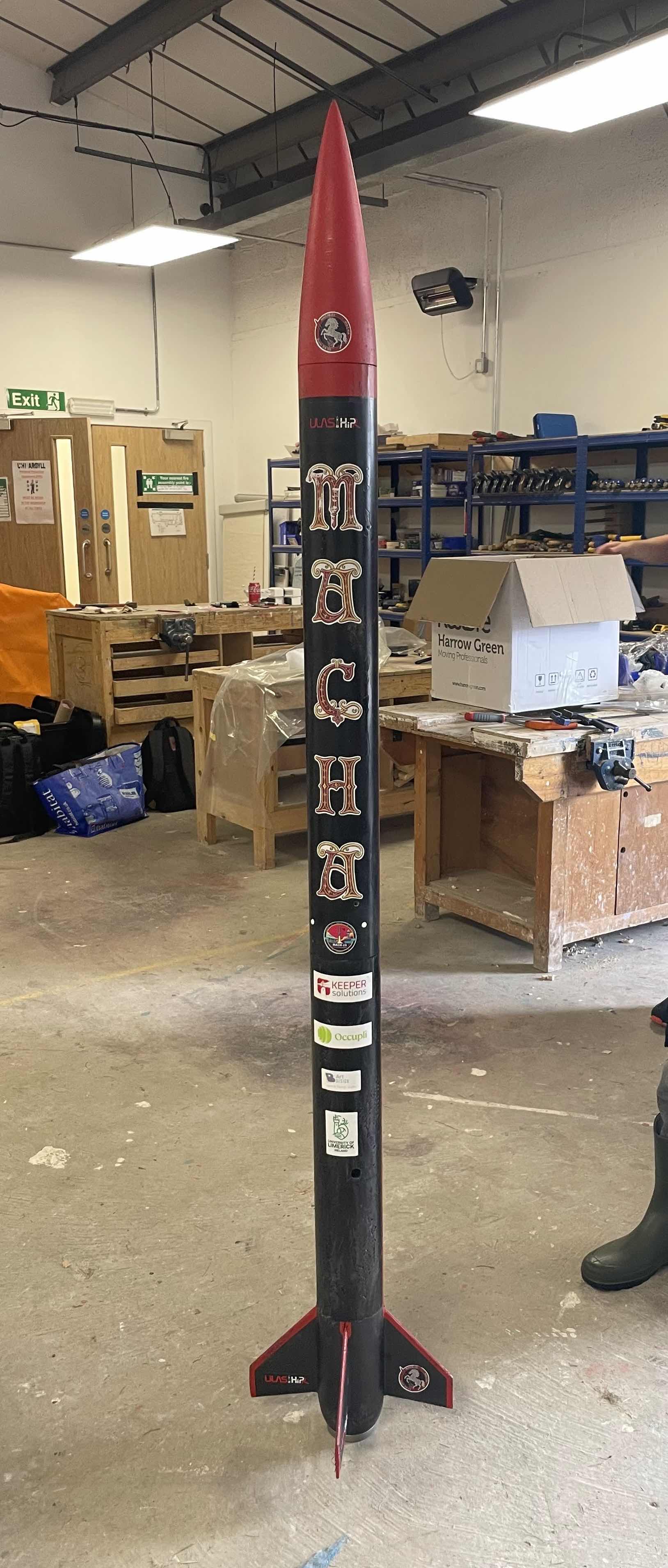 Macha was our Mach 25 competition rocket, it was made of a fiber glass upper section and a carbon fiber lower section. It was launched at the Mach 25 competition, where it placed second in its category, reaching 2.273km. It also successfully deployed a CanSat which mapped safe and unsafe landing zones during descent using AI.